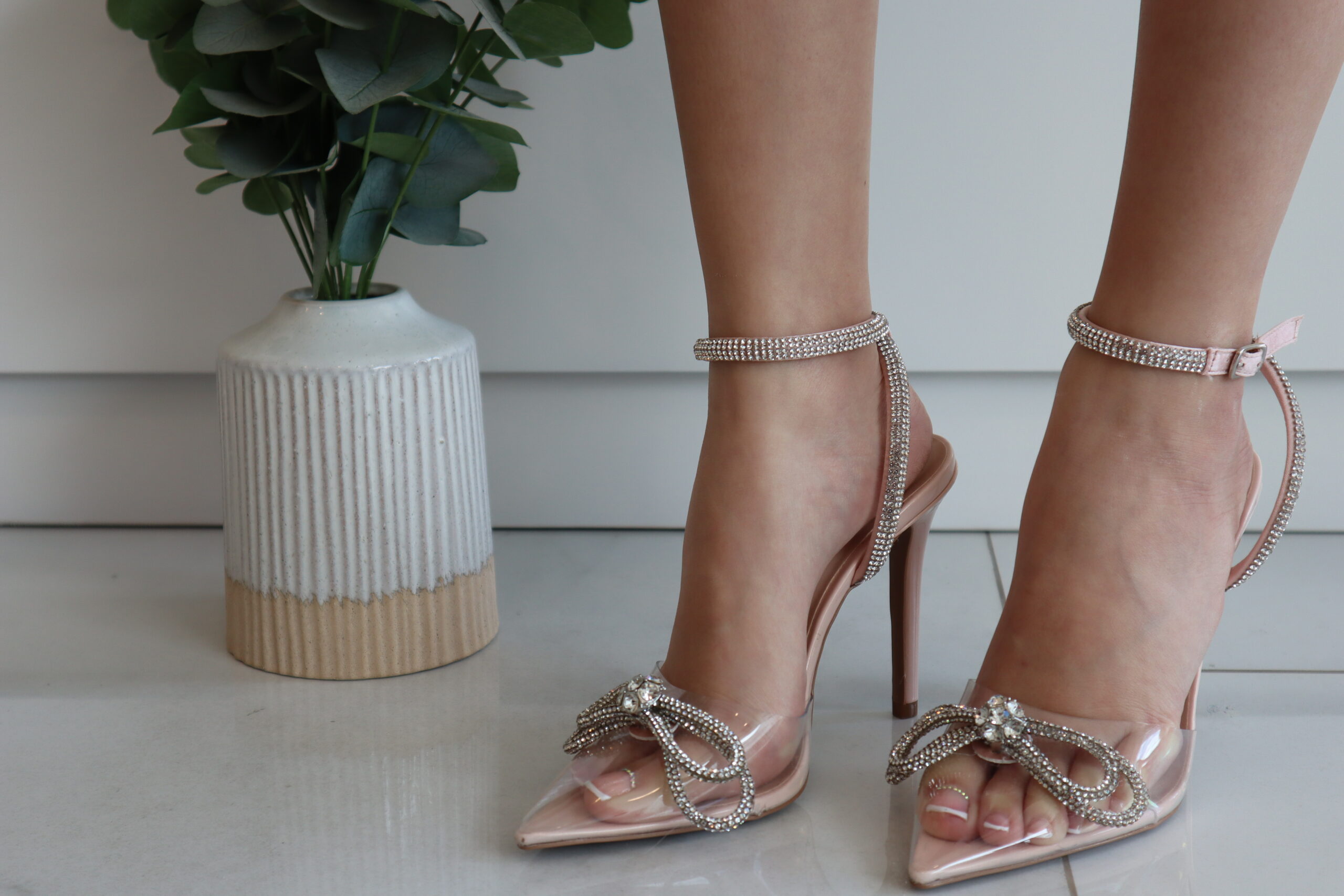 Tacones color rosado con detalles en perlas y lazo al frente.